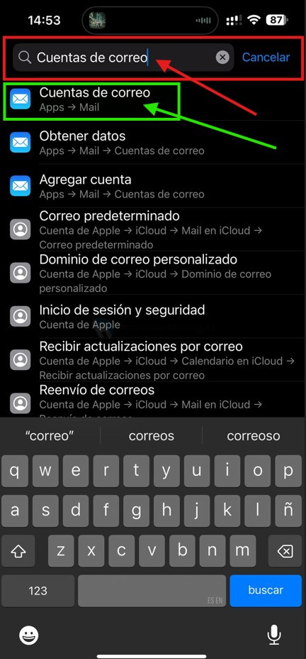 • En el buscador escribe Cuentas de Correo, dentro de los resultados de la búsqueda te mostrará «Cuentas de correo», como lo muestra la foto de abajo con rectángulo verde. Haz clic sobre ello.