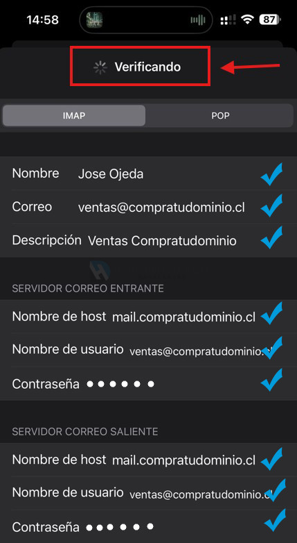 • En este paso el iphone verifica que los datos ingresados en la configuración logren conectarse correctamente con nuestro servidor de correo. Si los datos ingresados son los correctos, tu correo quedará configurado sin inconvenientes. En caso contrario, te aparecerá un aviso de ERROR. Por lo cual deberás volver atráz y verificar los datos que ingresaste y continuar con los pasos que te indica el iphone.