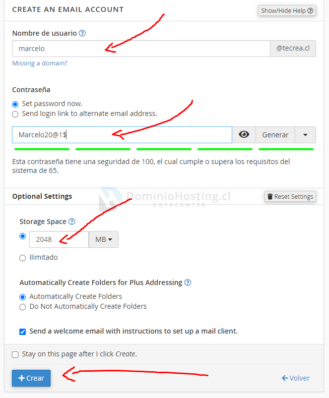Completa los datos para crear la cuenta de correo.