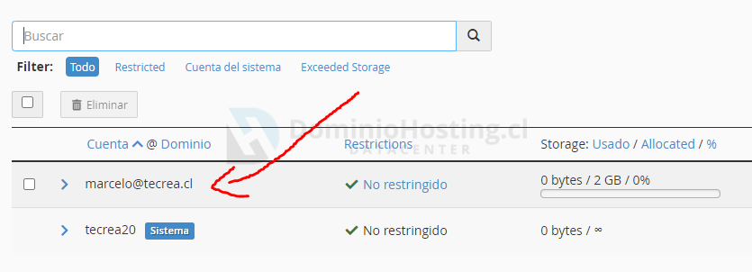 - En esta opción encontraremos una lista con las cuentas de correos existentes, aquí aunque no hayamos creado ninguna cuenta aún, siempre nos aparecerá una casilla con el nombre del dominio que es una cuenta por defecto que crea cPanel y no debemos eliminar.