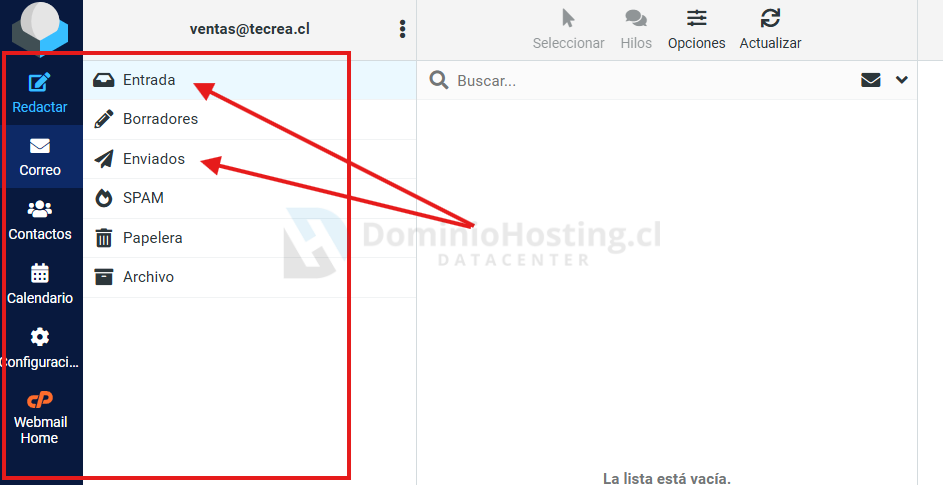 - Finalmente, haz accedido a tu correo, aquí encontrarás la bandeja de entrada, carpeta de enviados, spam y papelera. También tienes un botón que dice «Redactar», haz clic sobre él y comienza a enviar correos.